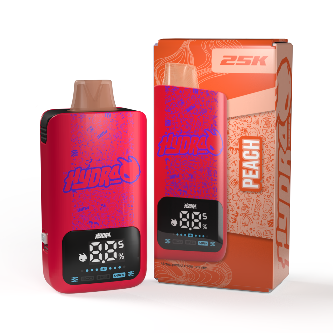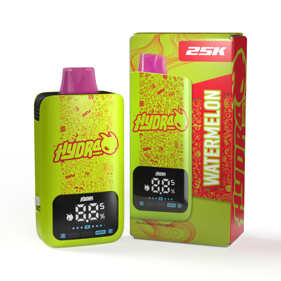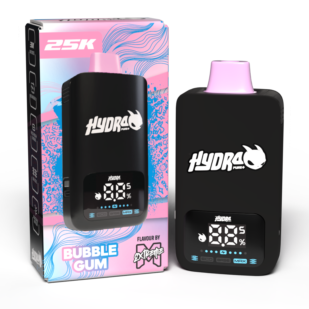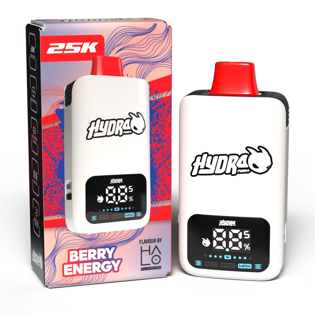 The Hydra Pro 25K puff system is a rechargeable battery base with pass through charging, 3 vape modes (ECO and BASE which use 1 coil, and MAX power which activates both coils) and adjustable air flow.