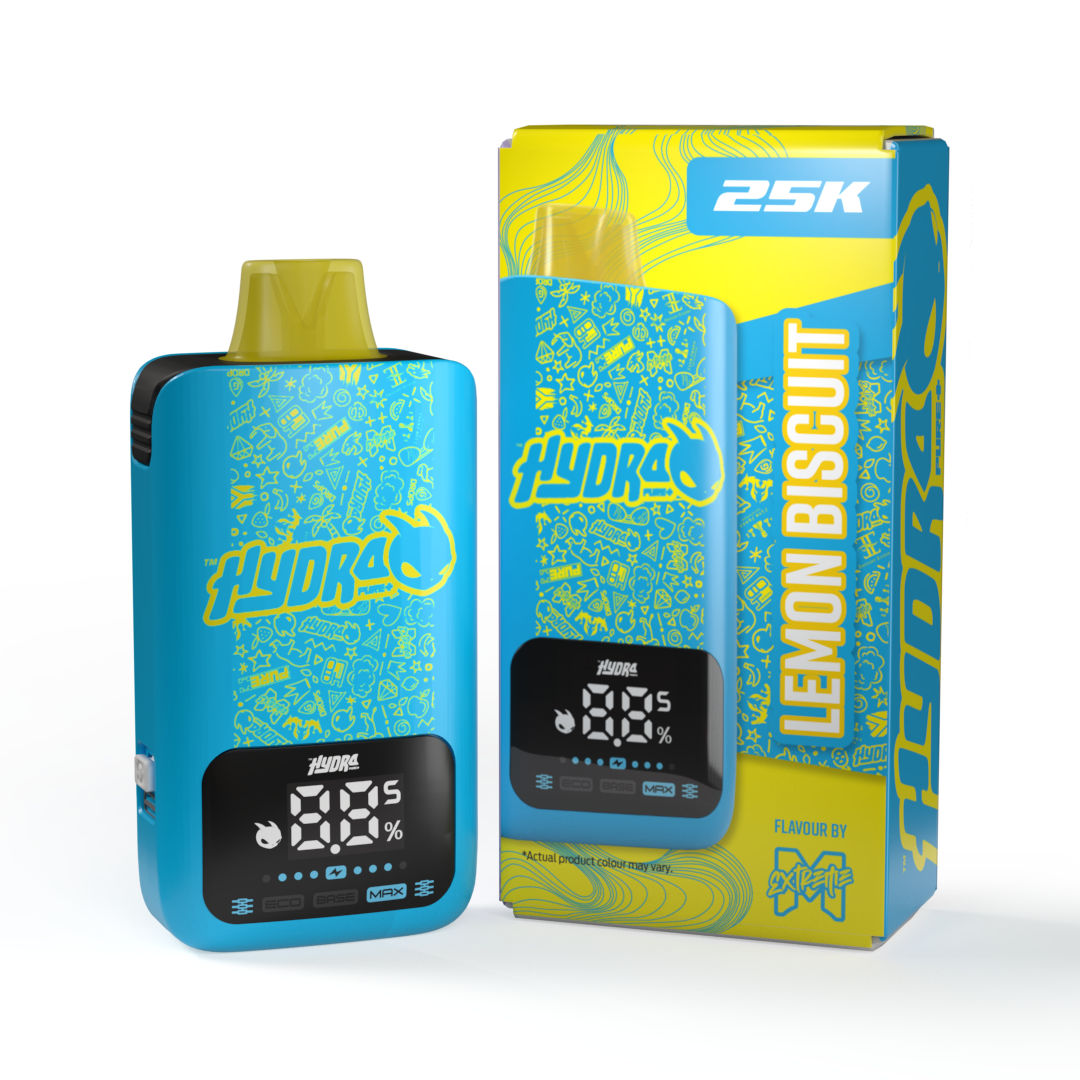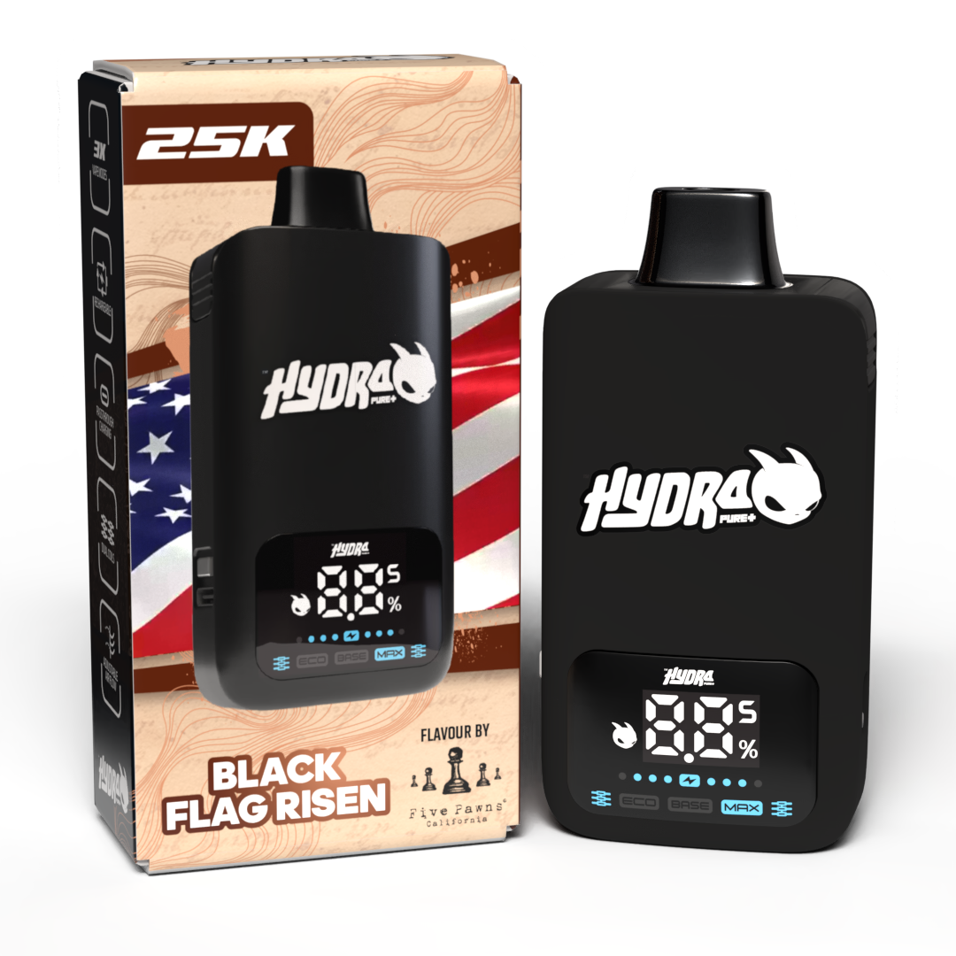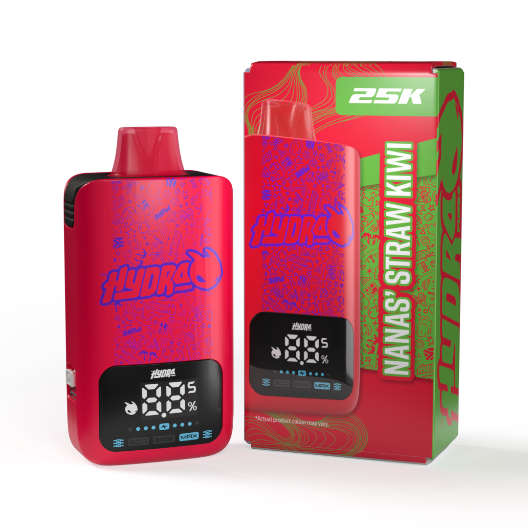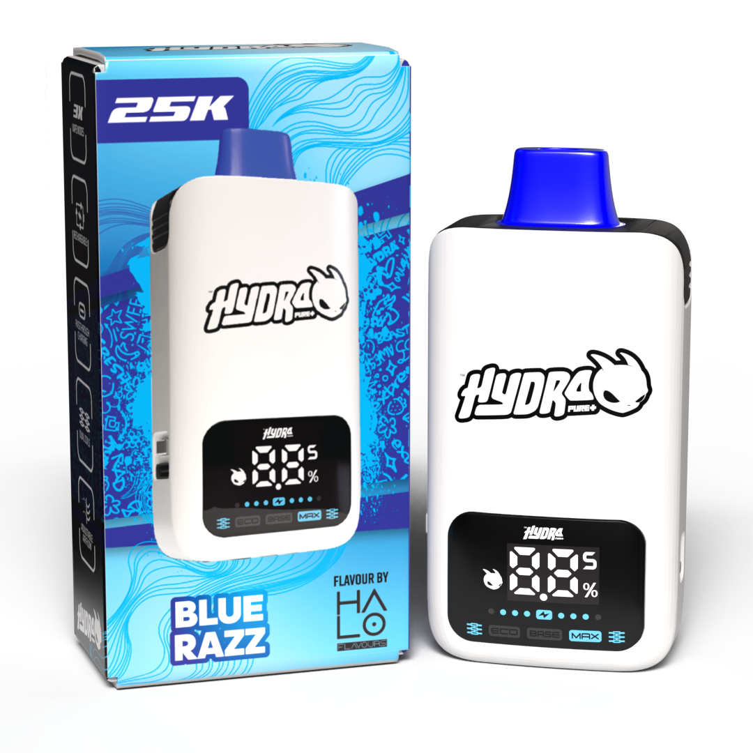 The Hydra Pro 25K puff system is a rechargeable battery base with pass through charging, 3 vape modes (ECO and BASE which use 1 coil, and MAX power which activates both coils) and adjustable air flow.